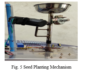 The seed planting machinery, which is made up of a solenoid coil and a vibrating motor, is programmed to plant seeds at precise spots at specific distances. After the plough mechanism, this mechanism is mounted above the moving metal framework. Initially, the movement of the mechanism must be calculated, which means that how far the mechanism travelled must be written down based on the time permitted to move it. For example, if both motors are propelled forward for 2 seconds, how far the device travelled must be noted down.