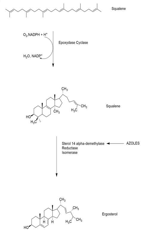 As mentioned above these work by blocking P-450 that is important to catalyse 14-α -demethylation of lanosterol to ergosterol this causes release of 14-methylated sterols which causes permeability disturbance [17].