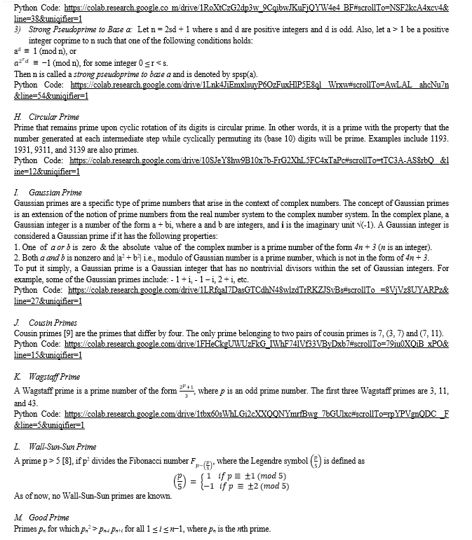 To provide a bit of a historical context, prime numbers are not exactly known to be discovered at the exact time. There is speculation that some of the very earliest human civilizations had some concept of primes, but the first concrete evidence appears to be some Papyrus writings of the ancient Egyptians from over 3500 years ago [5]. The ancient Greeks were the first to include prime numbers in their academic curriculum. Since then, a lot of mathematicians have contributed in this field of mathematics. In 1640, Pierre de Fermat stated (without proof) Fermat little theorem (later proved by Leibniz and Euler) also investigated the primality of the Fermat numbers 22n+1 , and Marin Mersenne studied the Mersenne primes, prime numbers of the form 2p- 1 with p itself a prime number. Goldbach formulated Goldbach’s conjecture, that every even number is the sum of two primes in a 1742 letter to Euler [7]. Likewise, Euler, Gauss, Chebyshev, and Reimann also contributed heavily, particularly in the distribution of primes. Still, study of prime numbers is very intriguing and challenging and there are numerous unsolved problems regarding prime numbers such as The Twin Prime Conjecture, Goldbach’s Conjecture, infinitely many primes of the form n# -1?, infinitely many primes of the form n2 + 1? [6] and many more.
