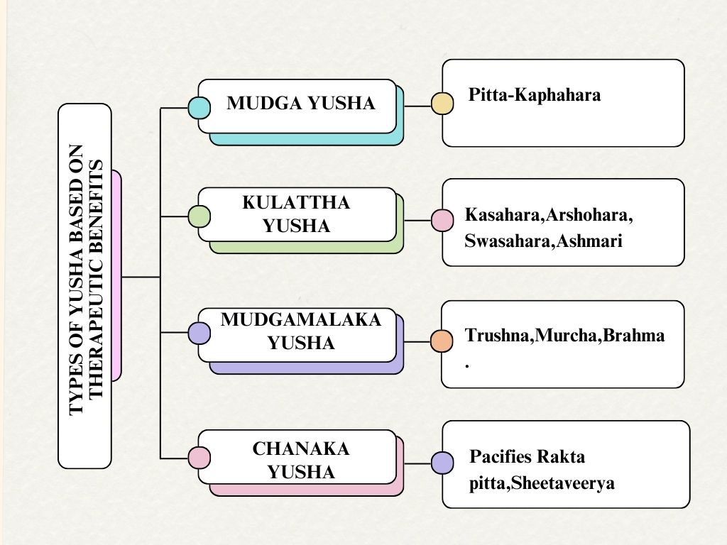 Yusha is fundamentally of a liquid nature, often with a soup-like consistency. Despite the widespread use of pulses like mudga and kulattha, there are several differences in the method in which Yusha is prepared and utilised. According to diverse criteria, such as the substances employed, the kind of preparation, the medicinal purpose, etc., Yusha has been categorised differently in the numerous Ayurvedic books and records. Figures 2- 5 represent different classifications of Yusha.
