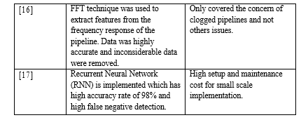 The detection and monitoring of clogged pipelines using an acoustic analysis method is proposed in Ref. [16]. The frequency response of the pipeline is analyzed using common techniques like Fast Fourier Transform (FFT) to extract relevant features. This approach provides highly accurate data by filtering out irrelevant information.