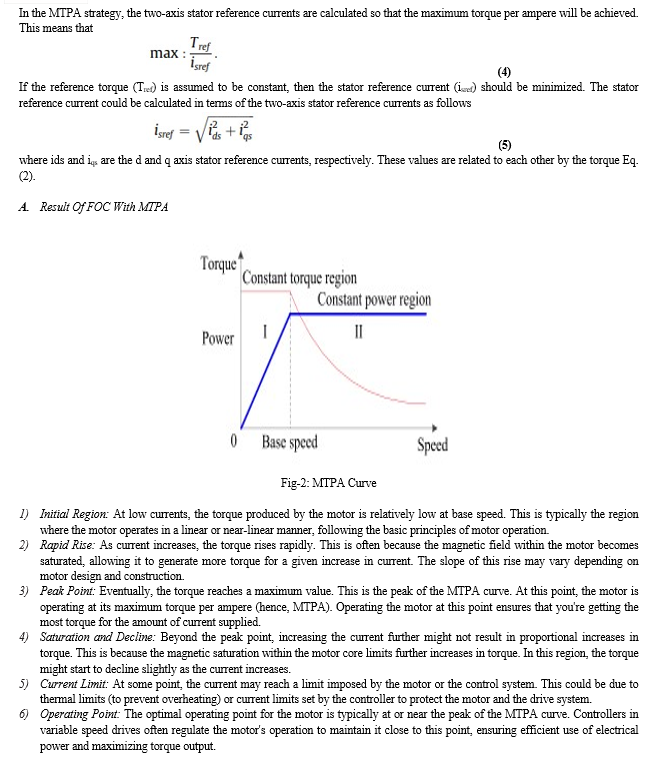 By integrating FOC principles with MTPA enhancement techniques, this control strategy enables precise control of motor torque and flux while maximizing efficiency by operating the motor at the optimal torque per ampere point. It is widely used in various applications requiring high-performance electric motor drives, such as electric vehicles, industrial machinery, and renewable energy systems.