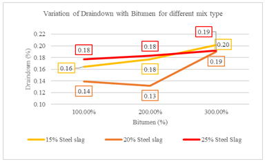 Draindown of binder is one of the most common features observed in gap-graded bituminous mixes such as Stone Matrix Asphalt and hence the effect of binder content on draindown characteristics of un-compacted fresh mix is an important parameter to address. This test was done in order to assure that binder drain off does not exceed 0.3%. The Draindown characteristics for the SMA mix were conducted for the conventional SMA mixes as well as for the SMA mix with optimized steel slag and fiber as obtained above, the results are tabulated in the