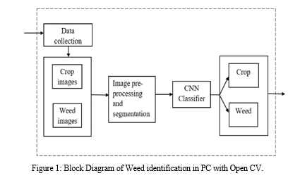 Many methods are used in concern with image processing to detect the weeds. The technique we using here is shown in figure. Using weed database which consist of healthy and unhealthy leaves, these images of the weeds are captured with the help of digital camera (PC camera). Fig.3.1 shows how the detection takes place through image processing technique. Here we will be using open cv, OpenCV is the huge open-source library for the computer vision, machine learning, and image processing and now it plays a major role in real-time operation which is very important in today’s systems. By using it, one can process images and videos to identify objects, faces, or even handwriting of a human. After detection, using the ZigBee module the command will be sent to weed robot, which will remove or cut the weed and spray the pesticide.