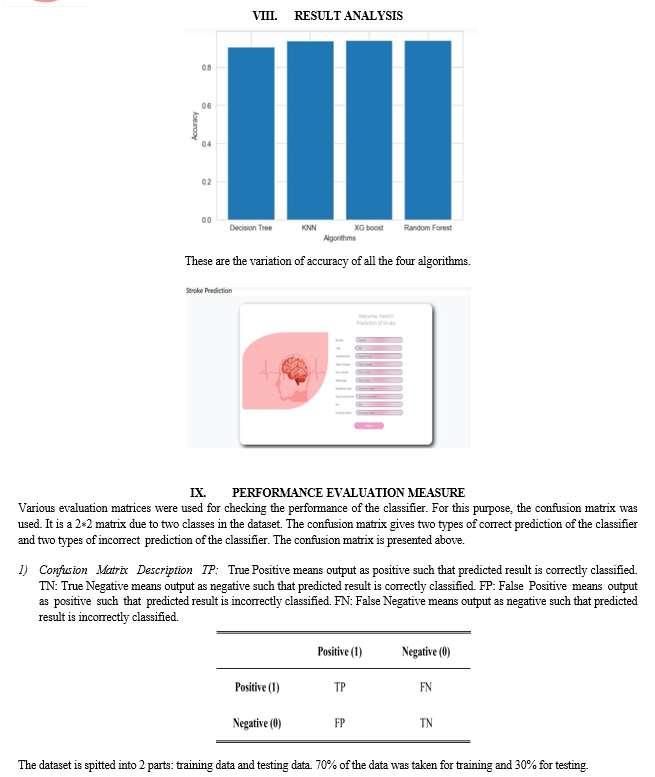 XI. FUTURE WORK This project helps to predict the stroke risk using prediction model in older people and for people who are addicted to the risk factors as mentioned in the project. In future, the same project can be extended to give the stroke percentage using the output of current project. This project can also be used to find the stroke probabilities in young people and underage people by collecting respective risk factor information’s and doctors consulting.