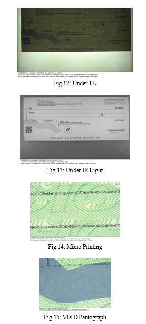 To analyze the security attributes of ICICI Bank cheques white light was illuminated, the cheque unveiled distinct security features like Pantographic Image, dimensions in accordance with CTS specifications, the prescribed color scheme, and adherence to the CTS System's layout and design (Fig. 9). Under spotlight illumination, watermarks of ICICI bank logo, CTS logo, and the logo of the printing paper company were readily visible, taking the form of circles positioned at various strategically placed locations (Fig. 10).When exposed to UV light, the cheque exhibited luminescent UV Security ink printing, and UV sensitive ICICI Bank logo (Fig. 11). In the transmitted light setting, the positioning of the ICICI Bank's logo was scrutinized through watermarks and fluorescent ink, among other notable elements (Fig. 12). No Infrared characteristics were observed, while Micro lettering featuring the bank's name and the Pantographic image with the inscription "VOID" were distinctly visible (Fig. 13, 14, and 15 respectively).