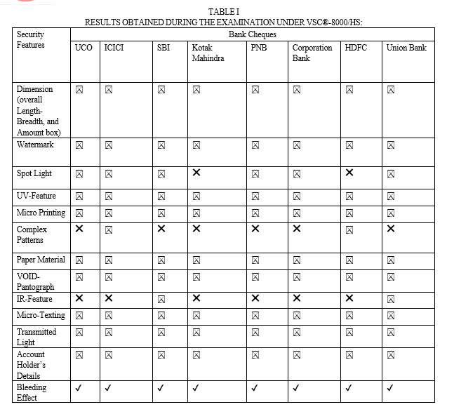 As per the Guidelines laid down under the CTS-2010, the formulated dimensions of the cheques issued by any Indian Bank were proposed. These dimension measurements form the basis for the authentication of cheques and it requires a lot of time, precision but with the use of advanced technologies like VSC-8000 and other portable instruments, authentication has become easier, more scientific, and universally standardized. ([9],[10]). The present study emphasizes the necessity of incorporating robust security measures to protect from counterfeiting and fraudulent activities, ensuring the integrity of the financial systems by showcasing the effectiveness of various security features present, such as watermarks, microprinting, UV-visible features, void pantograph, etc. These features not only differentiate genuine cheques from counterfeit ones but also act as a deterrent against potential fraudsters. Video Spectral Comparator (VSC-8000/HS) provides valuable insights into the unique security aspects of different bank cheques. The examination of each cheque allowed for a better understanding of their strengths and vulnerabilities, aiding in the continuous improvement of security features. The findings of this research will have significant implications for banks and financial institutions in their pursuit of fraud prevention and customer protection. By implementing robust security measures and continuous innovation in cheque design, printing, and technology, banks can mitigate the risks associated with counterfeit cheques and unauthorized alterations. List of Abbreviations: CTS- Cheque Truncation System HDFC- Housing Development Finance Corporation ICICI- Industrial Credit and Investment Corporation of India IR- Infrared MICR- Magnetic Ink Character Recognition PNB-Punjab National Bank RBI- Reserve Bank of India SBI- State Bank of India SL- Spot Light TL- Transmitted Light UCO Bank- United Commercial Bank UV- Ultra-Violet VSC- Video Spectral Comparator