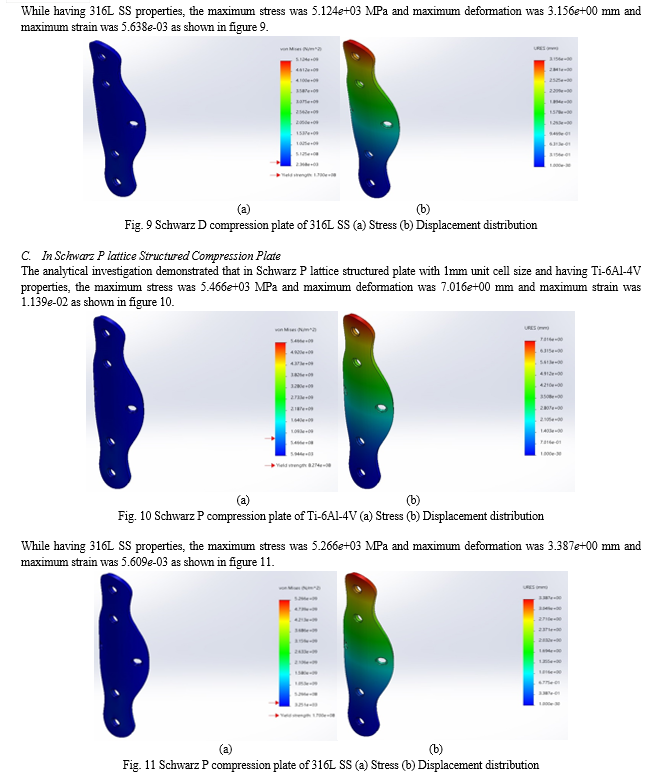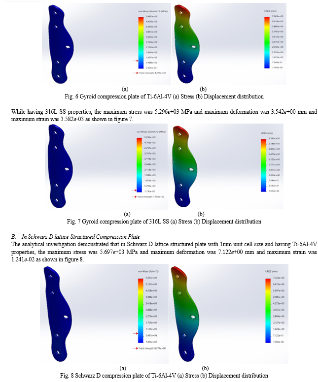 Compression plate of 316L SS material properties, Schwarz P lattice structure had least stress with almost 10% less than conventional plate and also lowest deformation while strain is lowest in Gyroid structure.