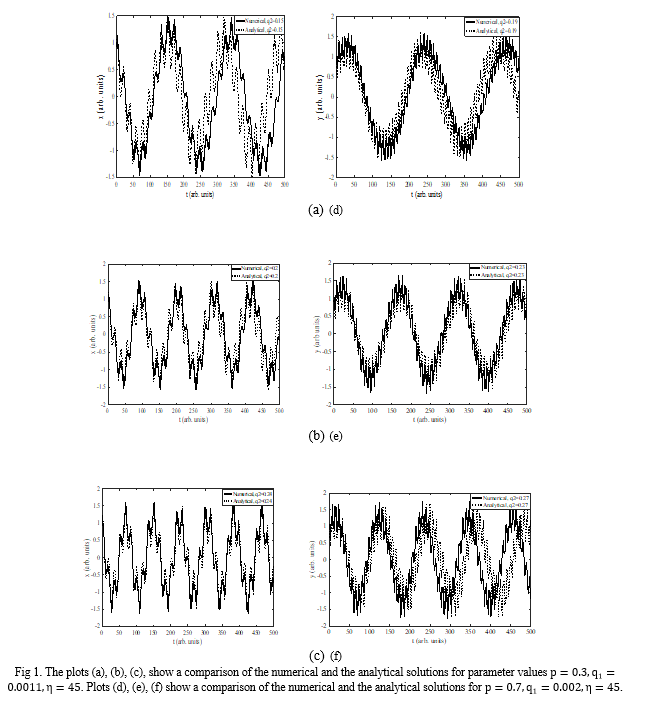 To obtain single frequency solutions one can simply substitute q_r=0 and keep ? away from unity. In most of the practical settings [7,15], the value of ? is substantially higher than unity, a regime wherein the analytical solutions are a good match to the numerical solutions. Experience guides us that analytical solution correct up-to first and second order are usually sufficient to provide deeper insights to both individual particle as well as collective dynamics inside the trap [17-19].