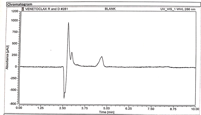 Based on the chemical nature of Venetoclax, different mobile phase systems and HPLC columns were tried to obtain a proper separation of the molecule. The initial trials were carried out on Perkin Elmer HPLC system using Inertsill C18 (4.6 x 250mm x 5 µm) column with a mobile phase consisting of 25mm KH2PO4 and Acetonitrile in the ratio of 70:30 v/v with an injection volume of 10µL and flow rate of 1ml/min. However, Broad peak shape was observed, and the theoretical plates were not in the acceptable limits. So for this reason this particular trial was rejected.