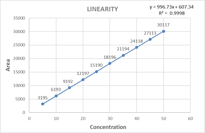 Linearity of a method is its ability to obtain test results that are directly proportional to the sample concentration over a given range. The capacity of an analytical process to produce test results that are directly proportional to the concentration of analyte in the sample (within a certain range) is referred to as linearity. If the method is linear, the test findings are proportional to the concentration of analyte in sample within a given range, either directly or through a well-defined mathematical transformation [4].