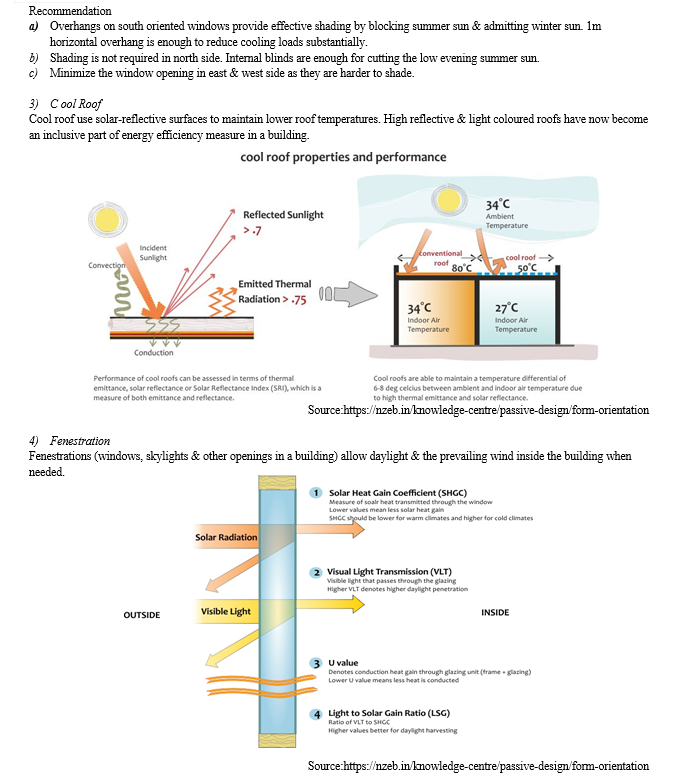 Approximately 5% of India’s total construction currently embraces sustainable design, indicating significant potential in the Indian market. The key to successful building design lies in the integration of both passive & active techniques. Emphasizing passive strategies are essential due to their cost-effectiveness & superior efficiency compared to active methods. For truly achieving sustainability it is imperative to prioritize passive strategies tailored to the local climate. Active techniques should function as supplementary elements rather than overshadowing passive approaches. The study concentrates on comprehending passive design strategies specific to India’s composite climate by analyzing case studies of various office buildings. The investigation delves into passive strategies such as orientation, fenestration, shading devices, earth touch, roof gardens, water features & landscaping. The proper use of passive techniques promotes energy saving.