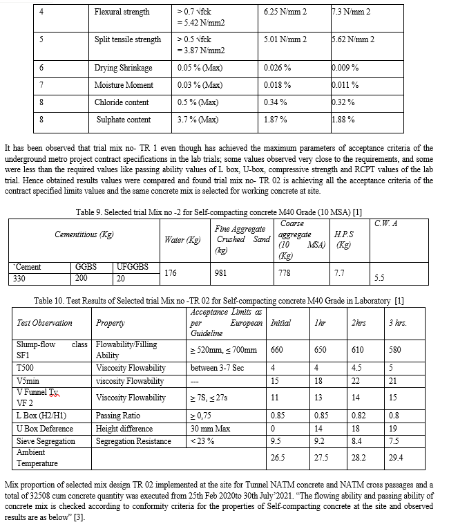 Selecting appropriate and suitable of materials plays an important role in concrete mix design to meet the general requirements of European guidelines for self-compacting concrete and to ensure a balance between deformability and stability. The type of selected materials and the ratios of concrete ingredients can be affected by the fresh and hardened properties of the concrete. In the contract agreement of the Mumbai Metro underground project, the technical specifications clearly state the values of limits set for achieving the durability parameters for the life of 120 years of the structure. According to the requirement of the site conditions Self-compacting concrete was designed with available material, special material like Ultra GGBS- Alccofine 1203 and crystalline waterproofing admixture. Self-compacting concrete is superior concrete than the traditional concrete with high workability, no segregation, no bleeding, and it is also suitable for use in structures with long-distance pumping in the instant case i.e., more than 120-meter length in Underground NATM tunnels, cross-passages, and the concrete structure of the underground metro station box. The paper presents a comparison between concrete mix designs and their achieved test parameters suitable for the contract specification of Mumbai metro underground project