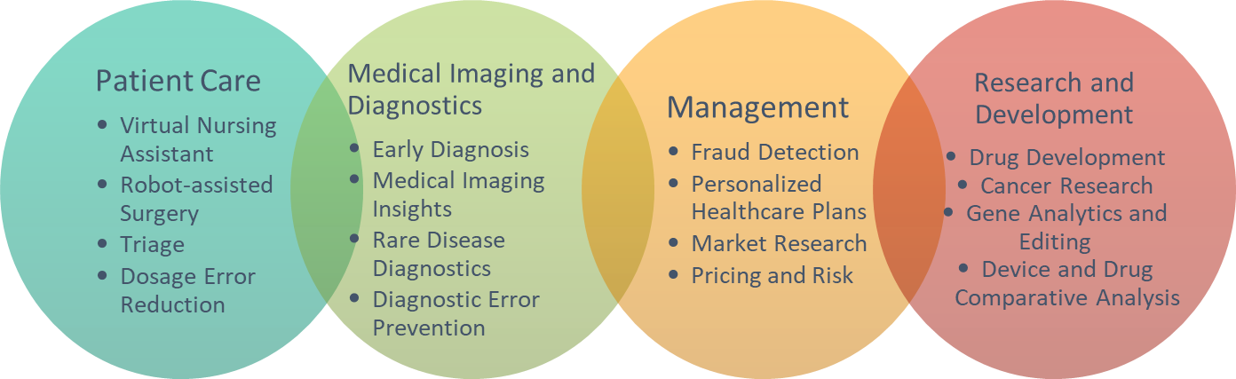 Fig. 1 shows the various applications of artificial intelligence in 4 broad domains under the healthcare industry, i.e., patient care, medical imaging and diagnosis, research and development and management.