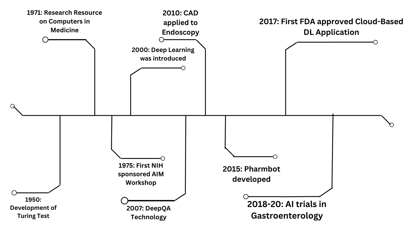 Though progress in technology in the healthcare domain has been slower than in most other aspects of our daily lives, the implementation of electronic health records (EHR) in more and more hospitals has increased medical data available. The large datasets which rapidly rise in complexity and volume form part of big data, provide the potential for ML models to make significant progress in diagnostics, medical image interpretation and treatment recommendations. Medicine can thus become faster, more efficient and personalized [5]. Fig. 2 depicts a timeline of the evolution of artificial intelligence in the healthcare industry. Beginning in 1950 with the creation of the Turing Test, the field has come a long way and the same is documented in the above diagram.