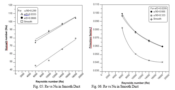 In order to determine the validity of the models, the Standard k? model, Renormalization-group (RNG) k-? model, Realizable k-? model, and Shear Stress Transport (SST) kU have all been studied for smooth ducts with the same cross-section as roughened ducts. In order to compare the outcomes of the various models, the Dittus-Boelter empirical correlation for the Nusselt number .The link between Nusselt number and Reynolds number for various models, and the computed values for a smooth duct using the Dittus-Boelter empirical relationship. Renormalization-group (RNG) k-? model results have been shown to be in good agreement with Dittus-Boelter empirical findings. In comparison to empirical correlation data, numerical model results obtained by SST ku have a higher deviation, whereas those obtained by Realizable k-? and Standard k-? have a lower deviation. Additionally, for low Reynolds number flows, the results from the Renormalization-group (RNG) k-? model and the Dittus-Boelter empirical model are nearly identical, but for higher Reynolds number flows, there is some variation in the results. Therefore, to simulate the flow and heat transfer for the current numerical analysis, the Renormalization-group (RNG) k-? model has been used.