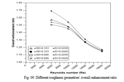 It is obvious that a surface roughness that produces a value for this parameter greater than unity can only be beneficial. The performance of the solar air heater is improved with a higher value for this parameter. The overall enhancement ratio for the solar air heater with various rib configurations for Reynolds numbers ranging from 6000 to 18000 is shown in Fig. 12. It has been discovered that the total enhancement ratio is more than one for any combination of roughness, and it peaks around the Reynolds number of 6000.