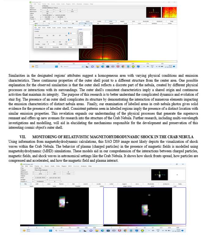 The Crab Nebula has been the subject of several studies because to its significance in understanding star formation, supernova remnants, and high-energy astrophysics. In this paper, we present a complete study of astronomical fitting file photos of the Crab Nebula using SAO DS9, a powerful and scalable software tool. Images, spectroscopy, luminosity values, catalogue data, and color mapping techniques are all employed in our investigation. The primary purpose of this research was to employ astrometric and spectroscopic techniques to analyze the intricate details and features of the Crab Nebula. We used SAO DS9 to analyze fits file pictures to reveal the nebula\'s morphological characteristics, intricate structures, and fine-scale features. I enhanced the nebula\'s visualization by employing numerous color maps, allowing us to acquire a better understanding of its emission properties and dynamic behavior. As part of our analysis, I also collected spectroscopic data from the fits files. These spectroscopic discoveries shed information on the nebula\'s physical properties and dynamics, as well as its origins and development. I retrieved and incorporated data from many scientific catalogues to widen the scope of our inquiry. To characterize the fluctuation and energy distribution of the Crab Nebula, we systematically analyze tabular data, including brightness values. I also used photos from multiple sites to supplement our study. These extra photos provided different views and complementing data, allowing us to examine the structure and behavior of the Crab Nebula. I got substantial insights into the Crab Nebula\'s features, dynamics, and physical qualities by merging photos, spectroscopy, catalogue data, color mapping algorithms, and data from numerous servers. This research adds to our understanding of supernova remnants and lays the groundwork for future high-energy astrophysics research. The special and exclusive to it characteristics and properties of Crab Nebula increase its importance and role in explaining the fundamental processes of astrophysics. The Crab Nebula is also called as Messier 1 and was formed by an explosion in 1054 AD, not to forget that this explosion was observable for humans back then. It has been one of the most studied on object. It is distinguished from a fast-spinning pulsar by the Crab Nebula. Overall, the research study illustrates the use of SAO DS9 as a complete software tool for analyzing astronomical fit file pictures. We got substantial insights into the Crab Nebula\'s features, dynamics, and physical qualities by merging photos, spectroscopy, catalogue data, color mapping algorithms, and data from numerous servers.