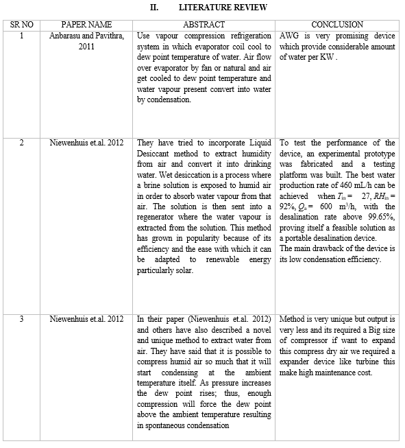 This is enough to motivate many research to work on related topic AWG (ATMOSPHERIC WATERGENERATOR) one of the promising device to condense the water vapour present in atmosphere for this purpose the project group will initially investigate the suitability of the vapor-compression cycle, where the extraction will be obtained on the evaporator. An AWG is a device that generates clean drinking water by utilizing the natural presence of water vapor in the air. This thesis will hopefully result in information that will be used as a basic data for decision-making. Since most of the evaporators on the market today are designed merely to cool the air passing through them, much effort will be made to design an evaporator that not only lower the temperature but also condensate some of the water vapor included in the air and to collect the condensed water if this technology is assessed to be liable. There can also be other technologies that can be more suitable for this application. The main purpose is to investigate which technology is the most suitable one in order to extract water. Other possible solutions for this problem will be presented, explained and discussed. The purpose is to find and develop a technology applicable for water extraction.