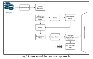 To help the model learn to distinguish between audio files, features are extracted from the audio files. Figure 1 illustrates the overview of the suggested approach. Audio signals cannot be used as input to the model in raw format due to the presence of noise. Thus, feature extraction from the audio signals is essential. The most widely employed technique for feature extraction is MFCC [19]. The feature extraction process is performed using the Librosa library in Python, which is widely used for audio analysis. This library allows the visualization of audio signals and the use of different signal-processing techniques for feature extraction. The MFCC method is highly effective in providing a human-like perception of voice and achieving high accuracy in speech emotion recognition. MFCC reduces computational complexity, improves feature extraction, and enables the identification of parameters such as pitch and energy.