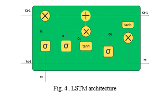 LSTM, (long short-term memory) networks, are a type of RNN(Recurrent neural network) [20]. Its main advantage over traditional RNNs is its ability to work with long sequential data, particularly in sequence prediction problems. Unlike traditional RNNs, LSTM does not lose information from previous iterations, with help of 4 gates LSTM manages to keep all the relevant previous information making it better suited for long sequential data, rather than just individual data points like images. This makes it well-suited for applications that involve sequential data such as machine translation. LSTM is a unique type of RNN that has demonstrated exceptional performance across a wide range of problems. LSTM architecture is illustrated in fig 4.