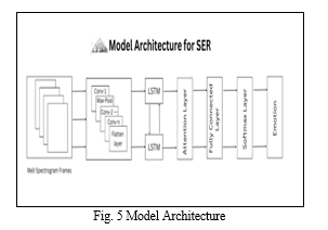 Output layer: The output layer uses a SoftMax activation function to convert the vector of probabilities. The class of emotion with the maximum probability percentage is selected and given as the output emotion for the given audio sequence. Model architecture is illustrated in Fig. 5