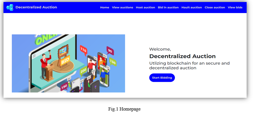The proposed system allows users to host and take part in online auctions. Users can participate in auctions after registering in the Metamask wallet. Metamask is a software crypto currency wallet that allows users to access their Crypto currency wallet and interact with a decentralized application. After successful creation of the account user will be able to host auctions by entering the necessary details such as product name, image, description, base price, and auction duration. They can also take part in ongoing auctions by placing bids. Users can keep track of their bids from the view bids section of the website. The host can halt his/her ongoing auction before time if satisfied with the final bid price. Once an auction is ended the winner can claim his/her prize by entering the product details of that auction in the close auction section. The crypto currency used in the proposed system is MATIC token which is an Ethereum token and all the transaction is happening in MATIC network. In the future, more currencies will be added to the system. For every transaction, users will need to pay a small amount as a Gas fee. The front end of the website is created with React.js – a JavaScript framework to build component-based websites. The backend is developed with node.js and express and for the database, we have used the Ethereum network as a decentralized database. The proposed system counters the drawbacks of existing centralized systems since the data is stored using blockchain technology which ensures transparency, robustness, and immutability.
