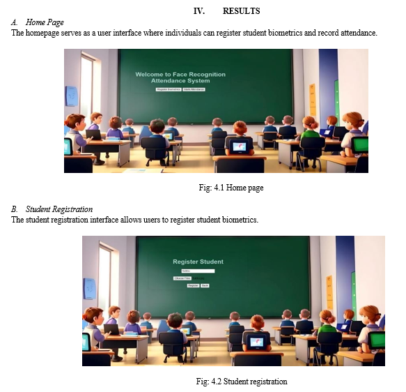 [1] “Xuexiao Chen ‘Study on Student Attendance System Based on Face Recognition.’doi 10.1088/1742-6596/2492/1/012015 [2] A. Lateef and M. Kamil, “Face Recognition- Based Automatic Attendance System in a Smart Classroom,” Iraqi Journal for Electrical and Electronic Engineering, vol. 20, no. 1, pp. 37–47, Jun. 2024, doi: 10.37917/ijeee.20.1.4. [3] K. Alhanaee, M. Alhammadi, N. Almenhali, and M. Shatnawi, “Face recognition smartattendance system using deep transfer learning,” in Procedia Computer Science, Elsevier B.V., 2021, pp. 4093–4102. doi: 10.1016/j.procs.2021.09.184. [4] G. R. Naufal, R. Kumala, R. M. I. T. Atha Amani, and W. Budiharto, “Deep learning-based face recognition system for attendance system,” ICIC Express Letters, Part B: Applications, vol. 12,no. 2, pp. 193–199, 2021, doi: 10.24507/icicelb.12.02.193. [5] A. S. Lateef and M. Y. Kamil, “Facial Recognition Technology-Based AttendanceManagement System Application in Smart Classroom,” Iraqi Journal for Computer Science andMathematics, pp. 136–158, Aug. 2023, doi: 10.52866/ijcsm.2023.02.03.012. [6] I. Khan, A. Khan, A. George, J. Golandaj, and S. Bhandari, “EasyChair Preprint A Survey on Automated Student Attendance Management System Using Face Recognition A Survey on Automated Student Attendance Management System Using Face Recognition,” 2023.