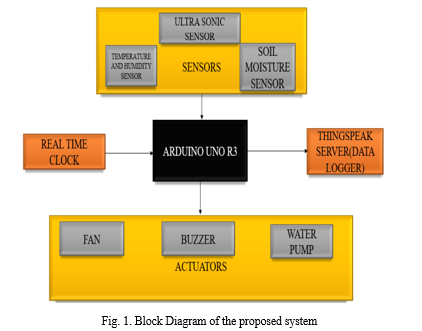 The ESP01 and relay modules takes input of 3.3v and all the sensors will take 5v input, both of which are available in the Arduino. A DHT11 is a basic and ultra-low-cost digital temperature and humidity sensor. It is connected to pin 5 of the Arduino. A Soil Moisture sensor which has two pins to read the soil moisture. It is connected to A0 pin. The Ultra Sonic sensor has two pins and that is used to check echo triggers. The trigger pin is connected to pin 9 and echo pin to pin 8 of the Arduino. An ESP01 Wi-Fi module is also used which enables the circuit to transmit the sensor values for monitoring. The receiver and transmitter are connected to pin 6 & 7 of the Arduino. One battery is used to power the Arduino, and the other two batteries are used to power the fan and the water pump. The Arduino microcontroller is programmed using C programming language using the Arduino Editor. First, sensors are initiated and calibrated, then they will read the parameters, i.e., temperature, humidity, soil moisture level and ultrasonic and will transmit the values to Arduino Uno R3. Then the Arduino will process the data received and will compare the values against the threshold values programmed. If found to be above threshold in the case of temperature and ultrasound and below in the case of soil moisture, the appropriate control measures will be taken. Simultaneously, the data will be transmitted to ThingSpeak using the ESP01 module for monitoring and storage.