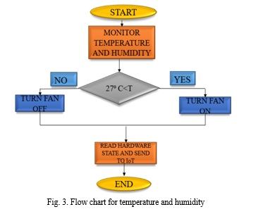 The process starts with the monitoring of temperature and humidity with the help of DHT11 sensor. And then the Arduino checks if the temperature is higher than the threshold value or lower. If higher, the fan is turned on and the value is sent to ThingSpeak server, and the process ends. If lower, the fan is turned off and the value is sent to ThingSpeak server, and the process ends.