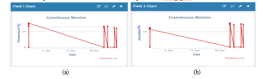 Figures shows the results of monitoring. Figs. 2 (a) shows the temperature monitoring. (b) is the humidity monitoring (c) shows the soil moisture monitoring and (d) shows the ultrasonic monitoring data from ThingSpeak.