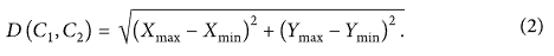 9. where C is the center of the binding box. Xmin and Xmax are the minimum and maximum values ??of the corresponding width of the binding box. Ymin and Ymax are the lowest and highest values ??of the equivalent length of the binding box. To measure the distance C1 (Xmax - Xmin) and C2 (Ymax - Ymin), between the center of each binding box, using the Euclidean formula, see equation (2), where the distance between the pixels is translated into a metric (distance range) and view-covered viewing field and then compared to a threshold value: