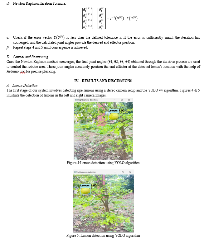 The system in figure 2 aims to automate the process of detecting ripe lemons on trees using a stereo camera and utilizing a robotic arm with 4 degrees of freedom to pluck them. The methodology involves the use of YOLO v4 (You Only Look Once version 4) algorithm for lemon detection, 2D-to-3D conversion of lemon positions using triangulation, and inverse kinematics for positioning the robotic arm's end effector accurately for plucking.