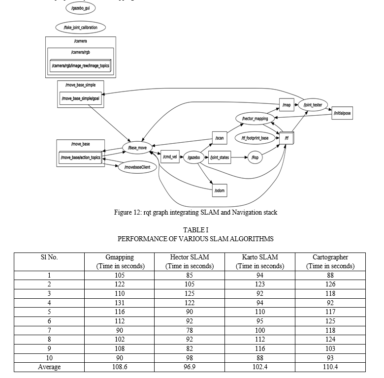 The performance of the above mentioned SLAMs is evaluated based on the time taken to map the environment and reach the goal location. To achieve this, SLAM algorithm is integrated with Navigation stack, which makes the robot move autonomously to the goal location. The rqt graph integrating the SLAM algorithm and the Navigation stack is shown in Figure 12. The results from Table I show that hector SLAM is the most efficient among the four SLAM algorithms.