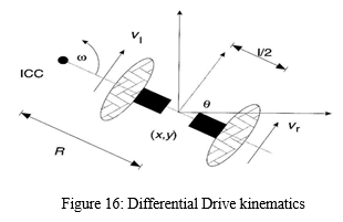 The proposed system uses a drive mechanism known as differential drive. A differential drive robot consists of two drive wheels which can be independently driven forward or backward. These two wheels are mounted on a common axis. To obtain the rolling motion, the velocity of the wheel has to be varied for each wheel. The point at which the robot rotates called Instantaneous Center of Curvature (ICC) lies on the common axis where the two wheels are mounted as shown in Figure16.