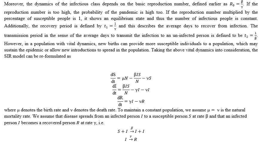 The dynamics of an epidemic are often much faster than the dynamics of birth and death, therefore, birth and death are omitted in simple compartmental models, like the SIR Model. The SIR system without the vital dynamics can be expressed by the following set of Ordinary Differential Equations: