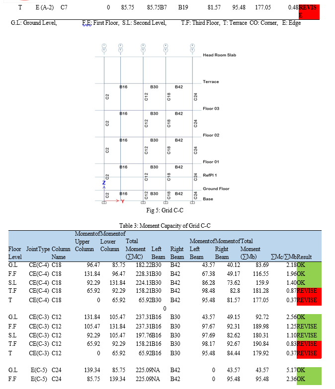The requirement that the moment capacity of a column should be at least 1.4 times the moment capacity of the connected beam is a critical design consideration in structural engineering. This ratio ensures that the column is stronger and more robust than the beam, preventing the catastrophic failure of the column and promoting the desired collapse mechanism where the beam yields first before the column. By prioritizing column strength over beam strength, structural integrity and occupant safety are enhanced, as the column acts as the backbone of the building and must be able to withstand extreme loading conditions without buckling or failing. 1) It is observed that with the increase in height of the building, the column is more susceptible to damage caused by seismic forces. 2) It is observed that the column situated near to the staircase failed from the first floor itself, which means that the columns supporting to the staircase should have more stiffness. 3) The columns situated at the edges and at corner are likely to fail earlier than the interior columns. 4) This design philosophy is essential for the construction of tall buildings, bridges, and other critical infrastructure that must be able to safely endure a wide range of loading scenarios over their lifetime.
