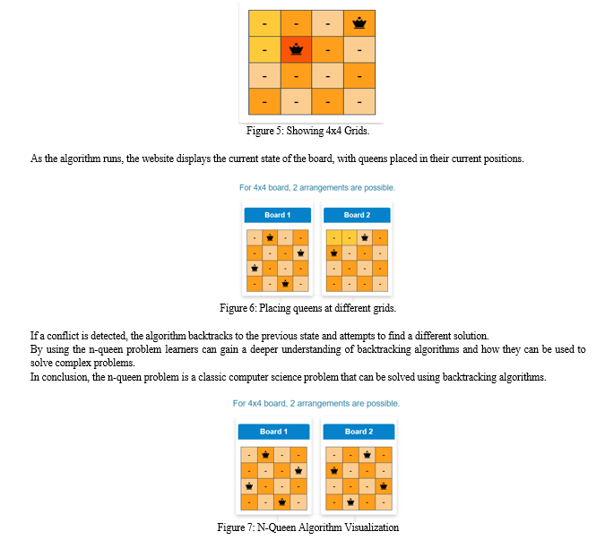 The interaction on the back end of the Visualizer system is simplified as here users can select the size of the chessboard and visualize the placement of queens using the backtracking algorithm. This simplification makes it easy for learners to visualize and observe how the N queen problem works.