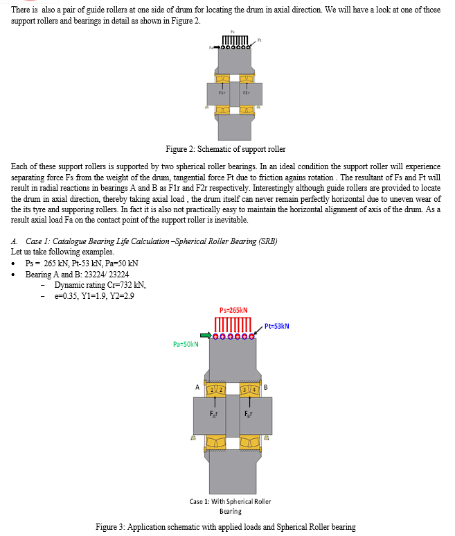 The following example in Figure 1 shows a loading system prevailing in mixing drums, barrel reclaimer , material disposal cylinders etc. The rotating drum vertical load is supported by four support rollers, two each side while the drum is rotated by a ring gear drive.