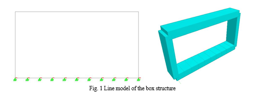 In 2-D line modeling method, the cross section of the box is modeled in a 2-D plane by joining the centre line of top slab, side walls and bottom slab. The width or the barrel length considered is 1m. Thus a 1m segment of barrel is considered for the analysis. Here, the 1m wide top slab, bottom slab and side walls are considered acting as beams. Loading is applied as uniformly distributed load (UDL) per unit width of the slab. Fig. 1 shows a typical line model and 1m width box segment from STAAD.PRO.