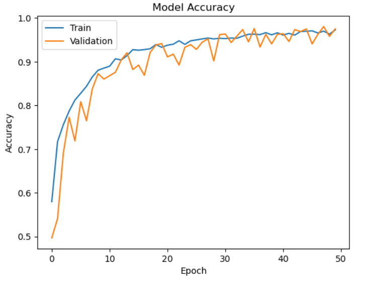 Fig.4 represents The accuracy of the CNN model throughout 50 epochs of training and validation is depicted in the graph. During the early epochs, both accuracies rise quickly, suggesting efficient learning. Early on, validation accuracy fluctuates slightly before settling at epoch 20. Both accuracies achieve a final value of roughly 0.98 to 1.0, indicating robust performance. Good generalization and little overfitting are demonstrated by the training and validation curves' tight alignment, which is probably the result of data augmentation and dropout. The model works consistently on unseen data if there is no discernible difference between the two. Small fluctuations in validation accuracy point to possible gains from changing the learning rate or running more epochs. All things considered, the model shows strong learning and excellent accuracy on the dataset.