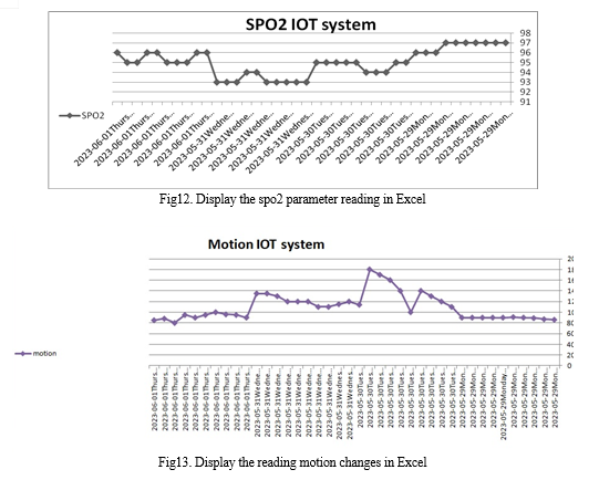 A remote health monitoring system using IOT is proposed where a person can receive, store and send data. The motion sensor can show the patient's mobility. The LM35 temperature sensor is a precision integrated circuit temperature device with linear output voltage proportional to Celsius temperature and has advantages over linear temperature sensors calibrated in Kelvin. MAX30100 is also a multipurpose sensor that displays heart rate along with pulse oximeter. Bluetooth HC05 is commonly used to connect small devices such as mobile phones using a short-range wireless connection for file exchange. Arduino UNO board is based on ATMega328P (receive datasheet). This board has 14 digital input and output (I/O) pins. The speed of data transfer in this board can vary up to 1 megabit per second and is within 10 meters. This board uses the 2.45 GHz frequency band. The Arduino processes the code and displays the patient data on the LCD screen. The HC05 Bluetooth module provides the connection through which the communication with the mobile application is established and the data appears on the mobile screen. By storing, sharing and transferring information, any disturbances in vital parameters and changes in life patterns are diagnosed by remote doctors.