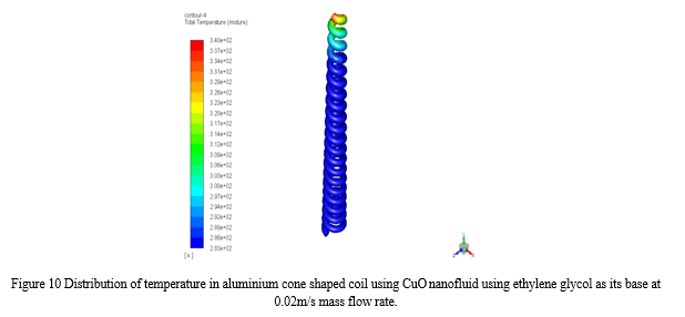 g. Case 7: Tube Diameter is 10 mm, CuO nanofluid is used as ethylene glycol as its base fluid in aluminium cone shaped coil, Max temperature is 338.4K at 0.02m/s mass flow rate.