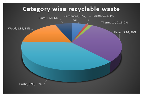 From the above table and Chart below we find Biodegradable Waste maximum followed by Recycleable and within that Plastic & Paper Waste. Some Hazardus Waste is also generated.