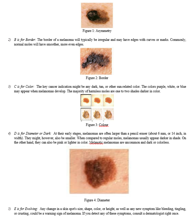 Once the melanomas begin to proliferate, the deadly skin disorder known as melanoma becomes uncontrollable. Melanoma can develop anywhere on the skin. A rare type of malignant skin tumor is melanoma. It certainly will spread to numerous places of the body and kill tissues nearby, unlike many other kinds of skin cancer. finding melanoma A biopsy is performed, including the removal of the irregular tissue as well as some of the nearby healthy tissue. A pathologist analyses the tissue under a microscope to look for malignant growth cells and then makes the difficult difference between a colored mole on the skin and an early melanoma harm. Patients might need to have another specialist analyze the tissue sample. Skin cancerous development is dangerous. A skin cancerous growth results from the melanocytic cells having abnormally. due to the possibility of melanoma, a skin cancerous growth[1]. Melanoma provides information about the skin's health, including whether or not bright radiation and genetic causes are responsible for it. The color of a melanoma sore is dark or darker. Melanoma may be completely treatable if caught early. Using a biopsy may be a common method to detect skin cancerous growths. This approach is harmful and painful [2]. Skin cancer is the most commonly malignant growth in the fair-skinned humanity and usually comes on by being exposed to bright light. Skin disease is the uncontrolled development of abnormal skin cells [3].