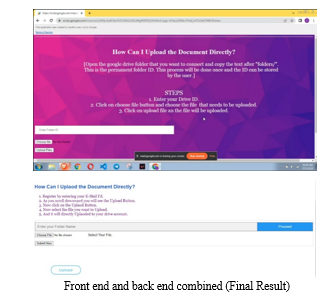 For this, we have used google script language which is basically JavaScript language with html and CSS. Google script made it easier to upload file in the drive where scanned file will get stored while html is used here to create the form, for overall web development of the site and CSS is used for the web designing. The results we get is the overall output of the combine code of Google script and HTML. It is not necessary that only scan file get store, we can use the other format file too from the PC.