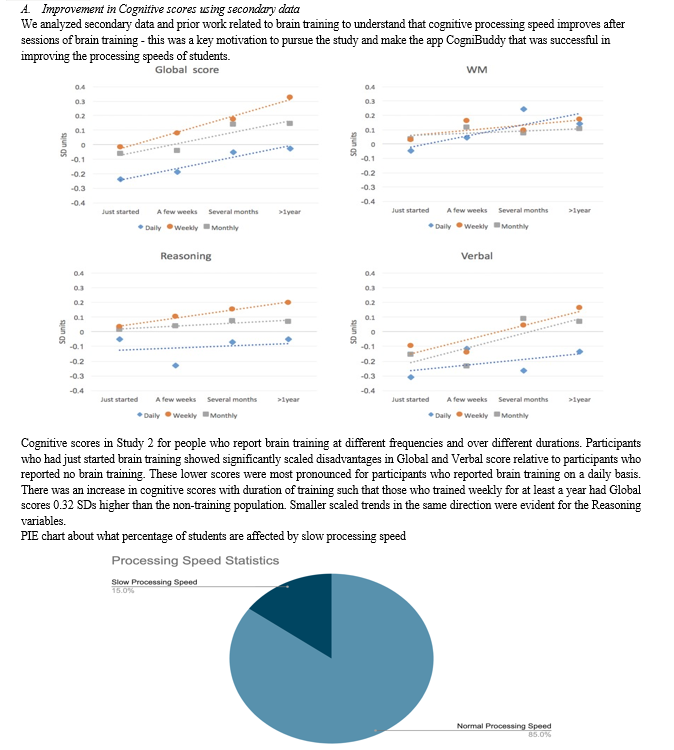 Therefore, the main objective is the development of CogniBuddy, an application that provides a blend of visual tasks related to response time, comprehension skills, and analytical thinking to improve cognitive performance. CogniBuddy was designed to be used by students between the ages 12-17 directly, enabling rapid statistical analysis to be conducted on the results. Brain processing speed was tracked through performance on different tasks, time taken to process complex tasks, and the accuracy, precision, and recall on different cognitive challenges.