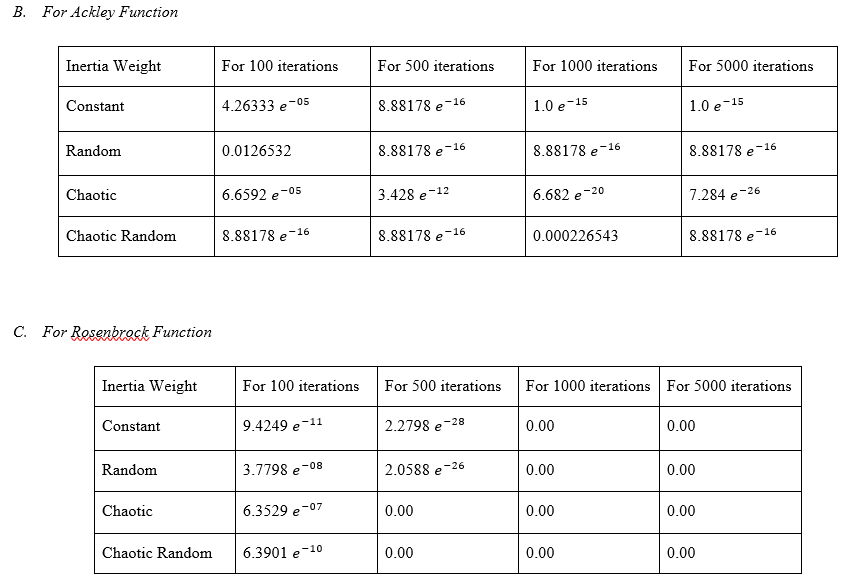 Swarm size is taken to be 50. The number of decision variables is fixed to be 10 for each experiment. The termination criterion is set to the “no improvement observed for 200 iterations (similar fitness value achieved for 200 consecutive iterations)”. For those which require a maximum number of iterations, 1000 iterations are used.