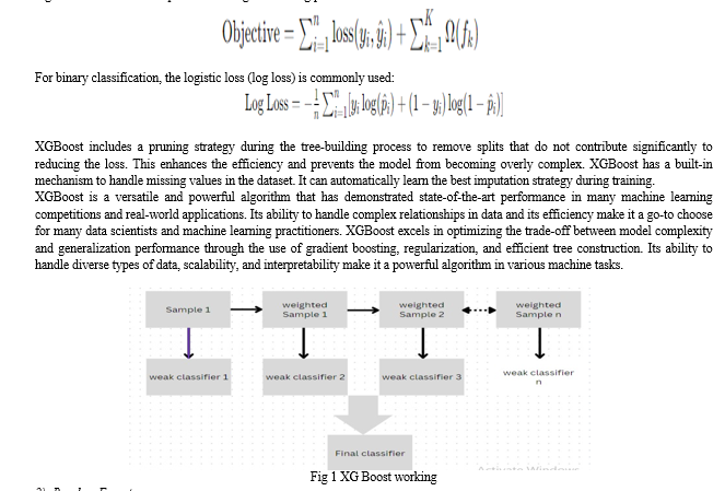 Harnessing the amalgamation of decision trees, it iteratively refines the predictive capacity by emphasizing misclassified instances, thereby fortifying the model's discernment. This method, characterized by gradient boosting, exhibits a penchant for optimizing predictive performance, making it a prominent choice. The objective function in XG Boost is a combination of a loss function and a regularization term. It is optimized during the training process.