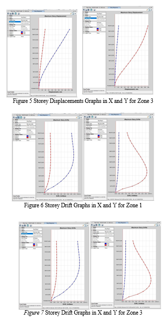 6) Storey shear: the storey shear is increased 13.13% for both x and y directions from zone 1 to zone 3.